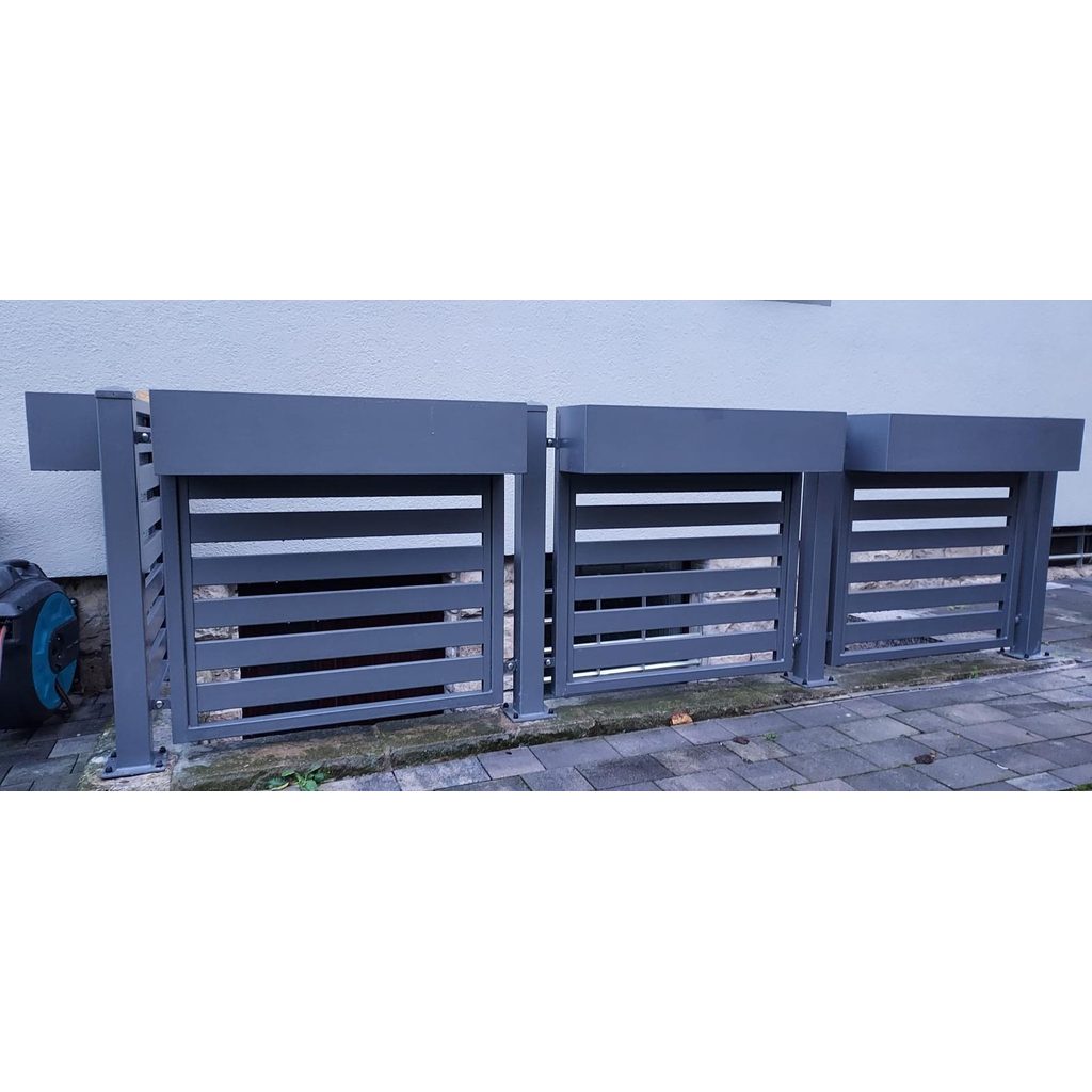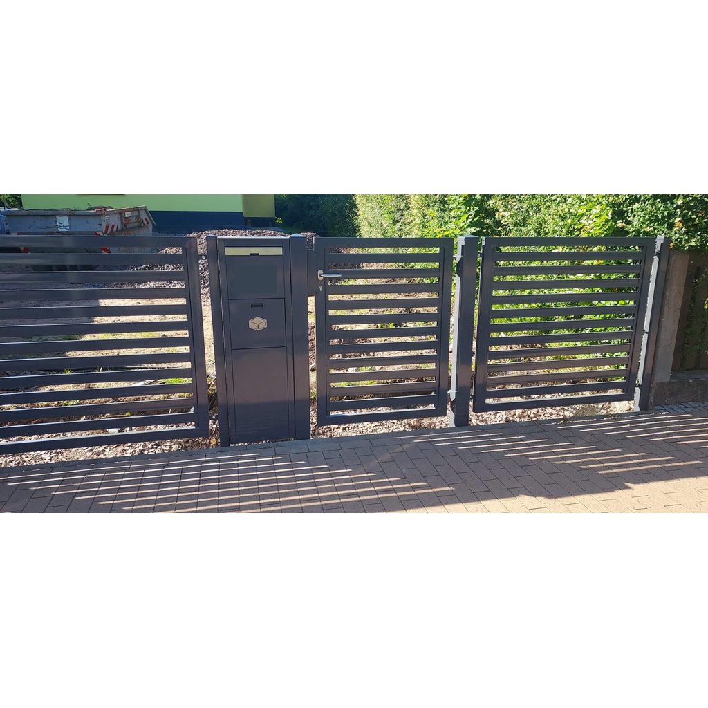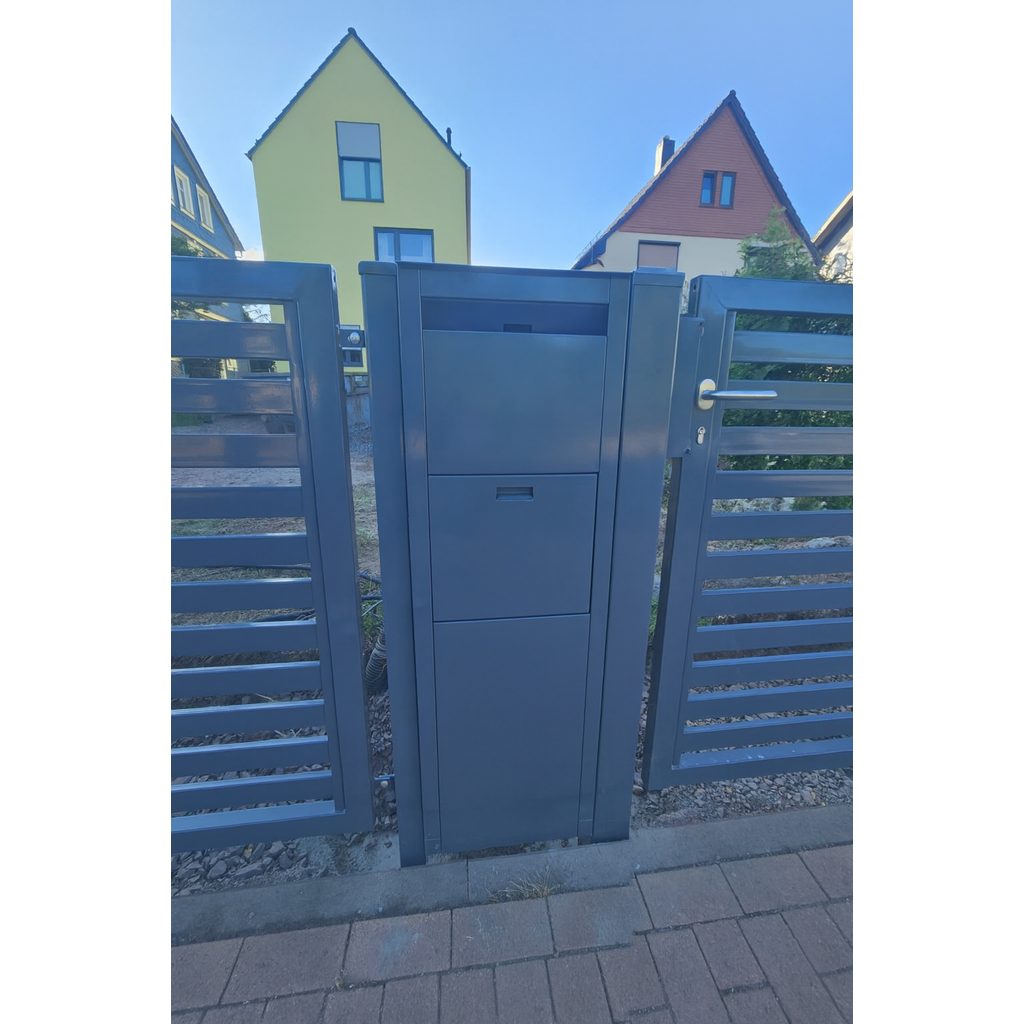 Neben unseren Standardlösungen fertigen wir auch individuelle Einzelanfertigungen aus Stahl ganz nach Ihren Wünschen. In den Beispielbildern sehen Sie unter anderem Mülltonnenüberdachungen, Hausnummern, integrierte Paketboxen und Briefkästen im Zaun, Blumenkästen oder auch Garagentore für Einfahrten mit Gefälle. Darüber hinaus sind vielfältige Projekte wie klassische Pavillons, Carports oder weitere Sonderlösungen denkbar – alles passgenau und langlebig gefertigt.
